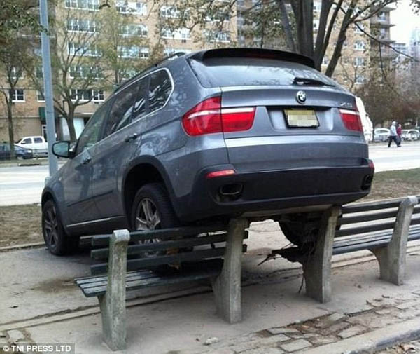 Someone tell this driver that benches are for people to sit; not cars!