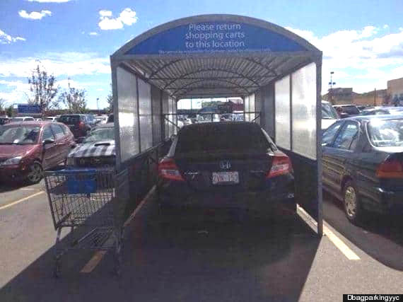 This idiot driver thought the is covered space was especially for him because he thought his car was a shopping cart.